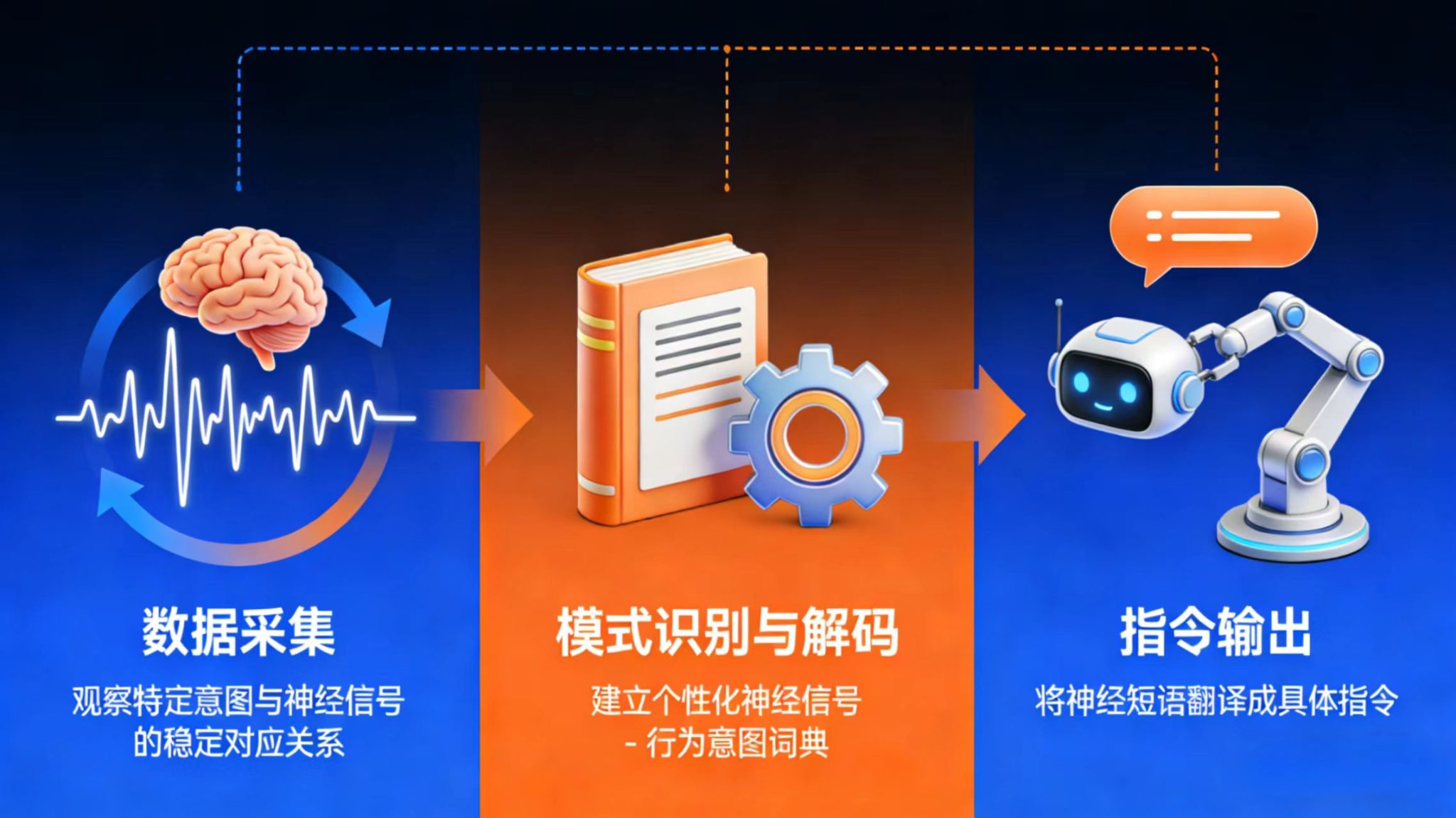 3.指令输出(执行):当用户再次产生相同意图时,系统能迅速识别出对应的“神经短语”,并将其翻译成“向左移动光标”或“驱动机械臂抬起”等具体指令。