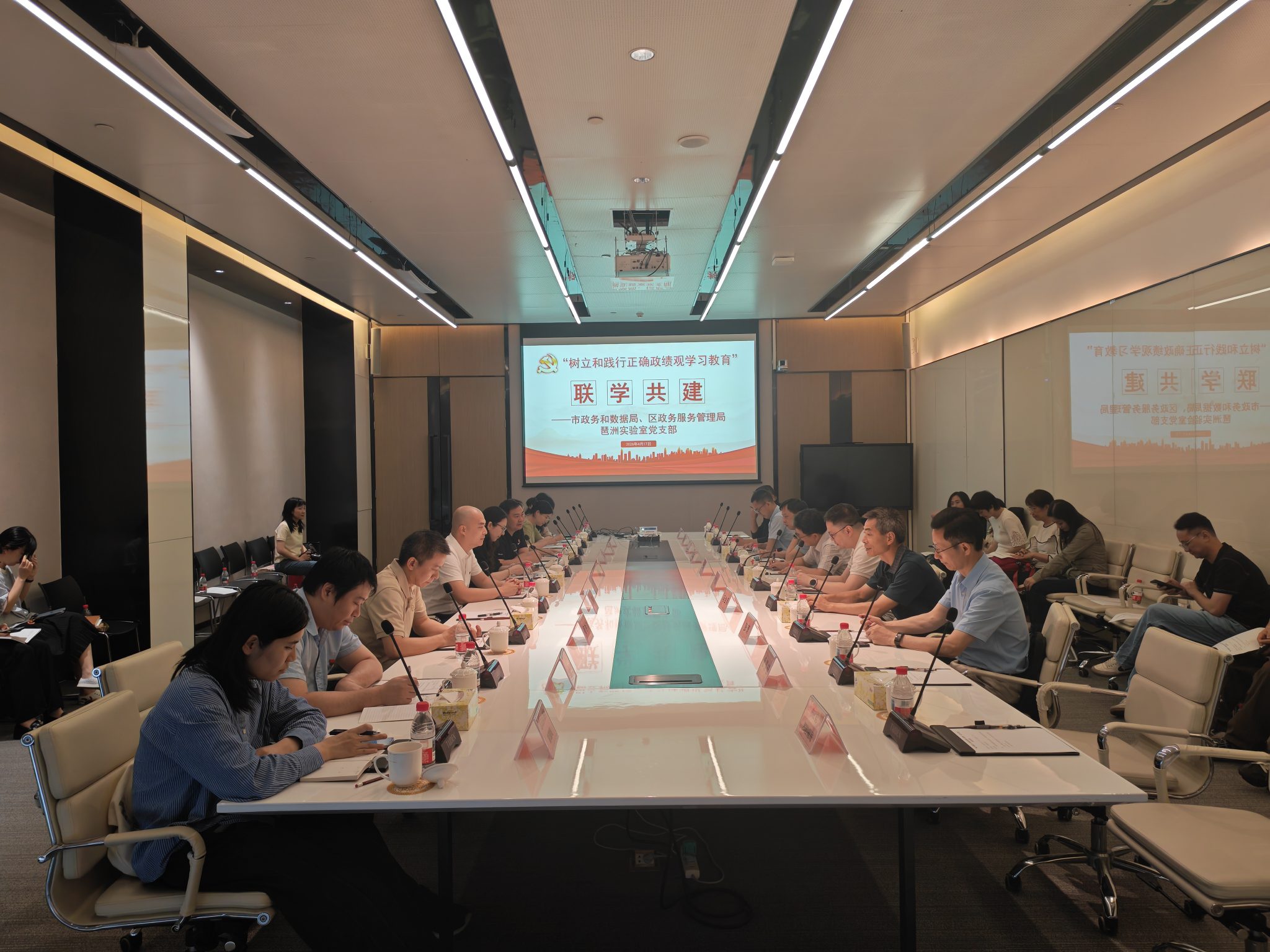 4月17日,琶洲实验室与广州市政务服务和数据管理局、海珠区政务服务管理局联合开展“树立和践行正确政绩观”主题联学共建活动,以科研践初心、以联学促实干,凝聚科技赋能民生、提升政务服务的合力,扎实开展树立和践行正确政绩观学习教育(以下简称学习教育)。广州市政务服务和数据管理局总工程师李刚、审批协调服务处处长蒲智、规划财务处处长杨垚鑫,海珠区政务服务管理局副局长黄长欣、孔冬冬,琶洲实验室党委副书记、行政副主任袁传思及党员共40余人参加活动。
